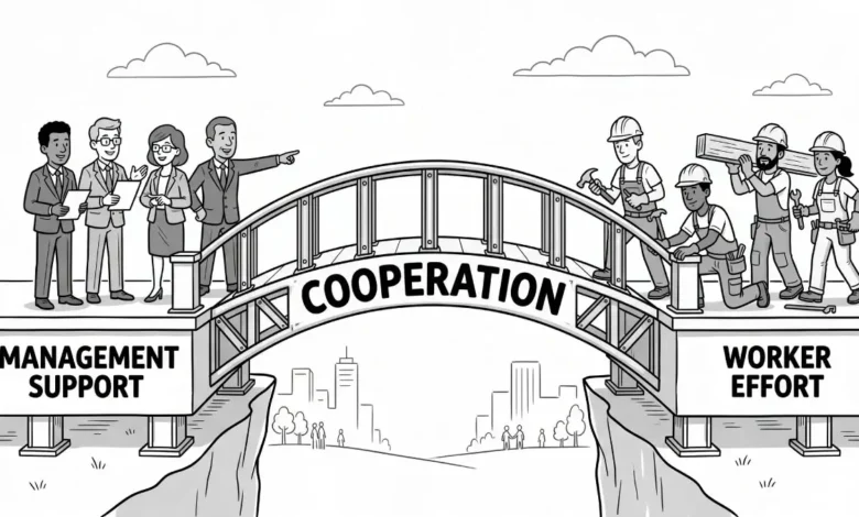 Cooperation is fostered when management provides the tools and environment for success, and workers provide the effort. This is often achieved through transparency and shared goals.